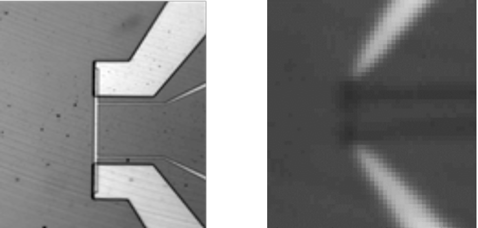 - (a)使用100倍物鏡和25萬像素CCD相機獲得的1微米寬的金加熱線路;