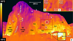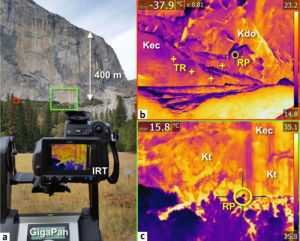 為了滿足這一需求,瑞士洛桑大學(xué)地球科學(xué)研究所通過將紅外熱成像技術(shù)與地面激光掃描技術(shù)結(jié)合起來,遠(yuǎn)程檢測位于優(yōu)勝美地山谷(美國加利福尼亞州)的El Capitan的東南面完整的巖石橋。在1000米高的懸崖上進(jìn)行了四個小時的紅外熱監(jiān)測,該溫度已在溫度下校準(zhǔn)并進(jìn)行了發(fā)射率效應(yīng)校正。在兩個定界的剝落薄片表面上出現(xiàn)的熱異?,F(xiàn)象解釋為巖石橋存在的跡象,得出了可能的巖石橋梁大小的估計(jì)值,然后將其用于評估兩個受監(jiān)控的剝離薄片的穩(wěn)定性條件。